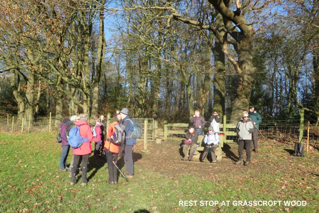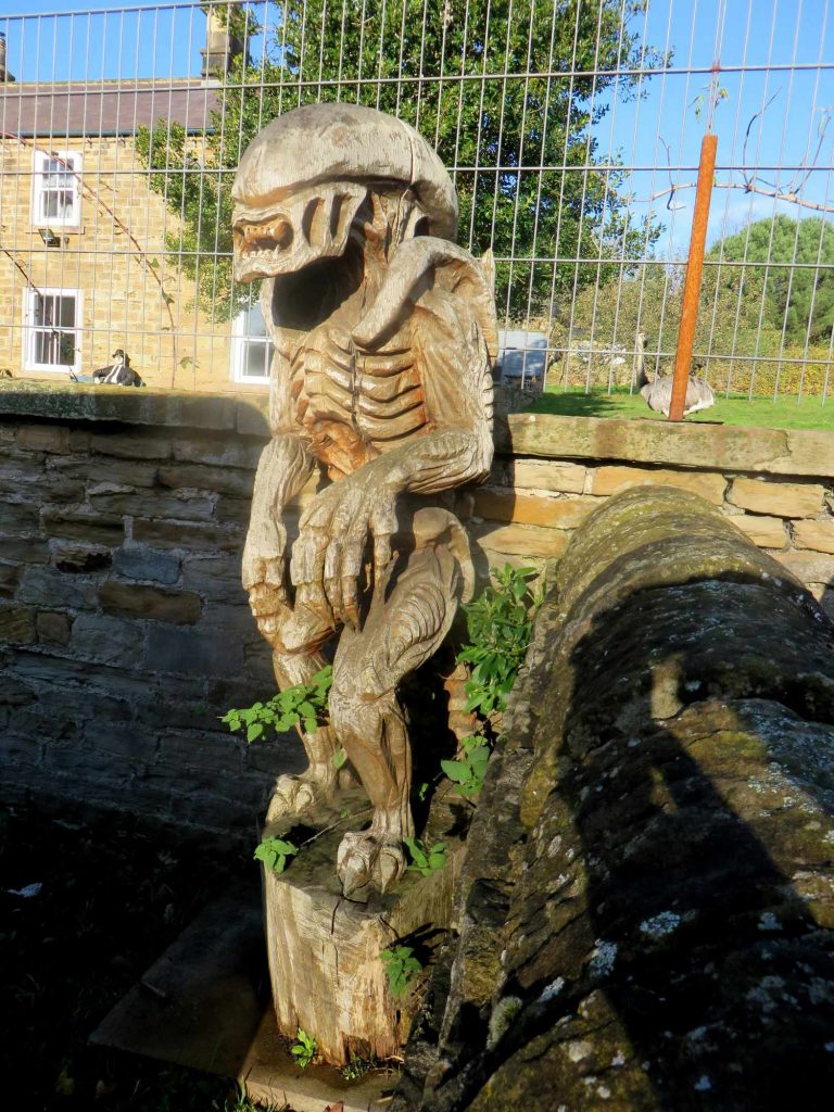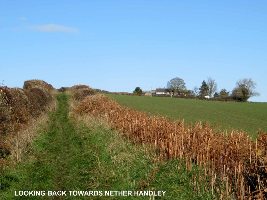 After passing by the impressive St Bartholomew’s church we climbed steadily up to Grasscroft wood where we had a brief drinks stop. We continued on through fields to another wood, unnamed on O/S maps, to almost reach Long Lane. Rather than walk along the road we took a diversion into Stubbing Wood, emerging from the wood opposite the turning to West Handley. Following a short stretch on the pavement we passed by an interesting property with a huge array of wooden sculptures of animals. Continuing on through fields we reached the hamlet Nether Handley where we followed an enclosed path all the way to Parkhouse Farm.