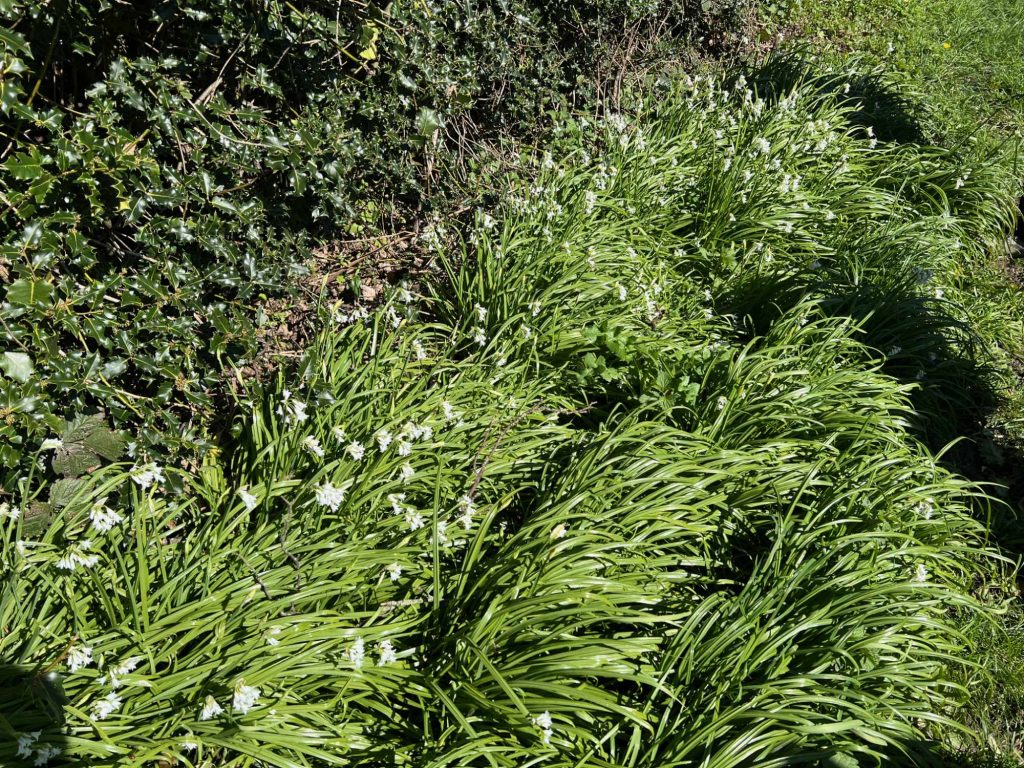 We took a left turn down a green way and then through houses. During this section Graham, our walk leader, pointed out the three-cornered leek, a white flower reminiscent of a bluebell that smells like onions when the stem is crushed between fingers.